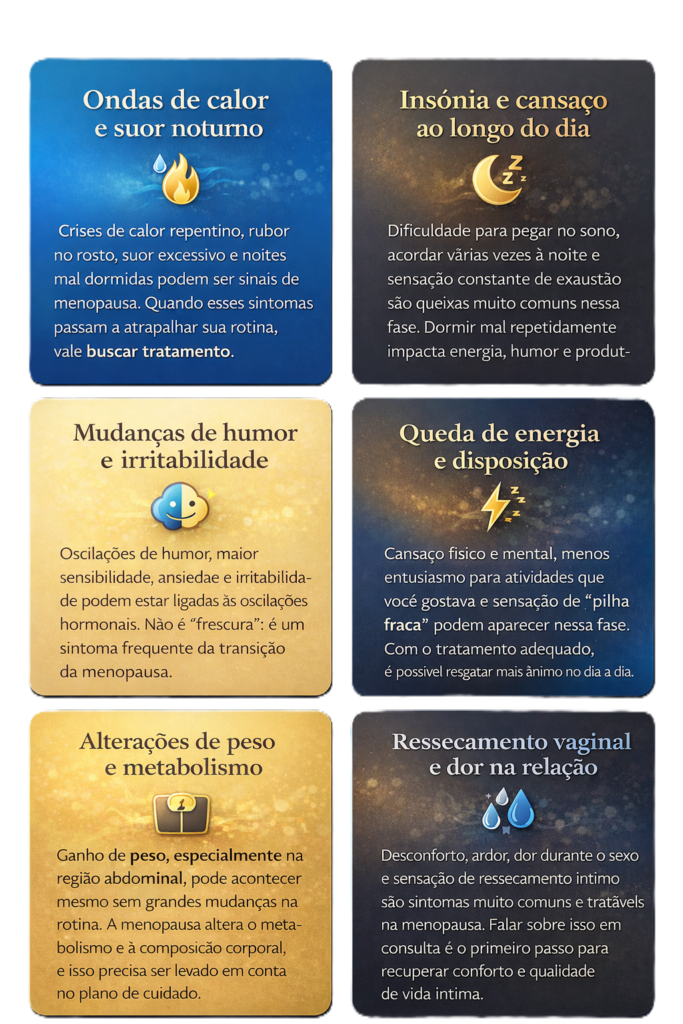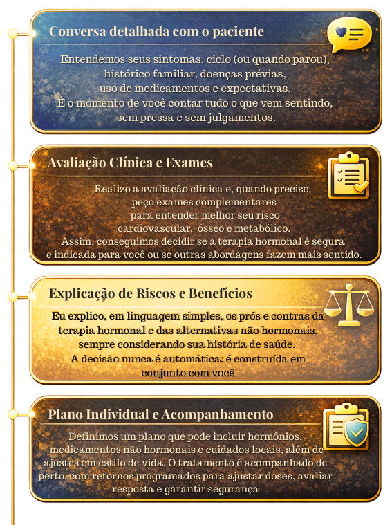 Na consulta, avaliamos seus sintomas, histórico e exames para definir se a terapia hormonal é indicada para você e quais alternativas não hormonais também podem ajudar.